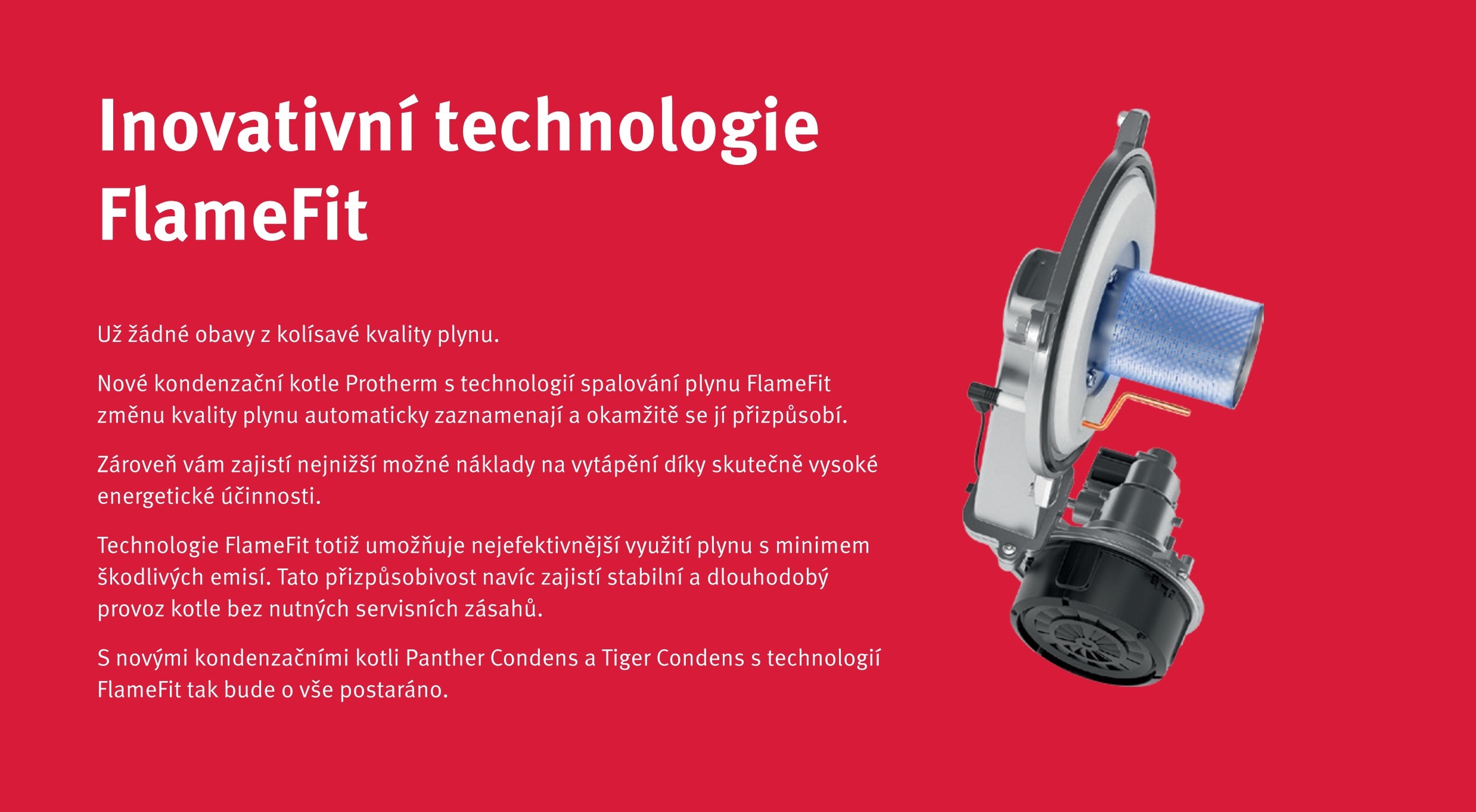 Panther Condens s inovativní technologií FlameFit se dokáže automaticky přizpůsobit měnící se kvalitě plynu. Díky této funkci zařízení nastaví spalování dle typu plynu. To znamená, že plyn je spalován efektivněji, množství spalin je redukováno a vy šetříte životní prostředí.
